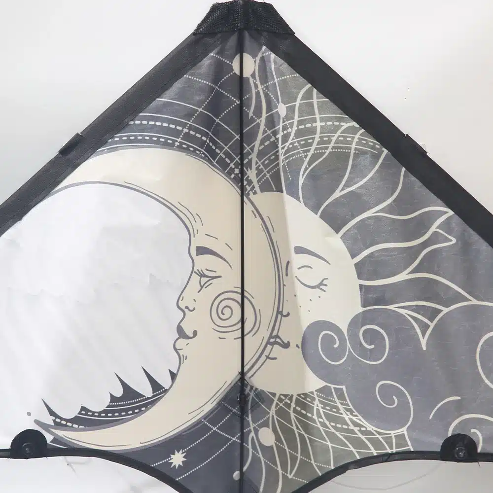 Un grand cerf-volant de 120 cm qui attire le regard avec son motif lune et soleil en noir et blanc. Sa forme delta offre une belle stabilité en vol et permet de profiter d’un rendu élégant dans le ciel.