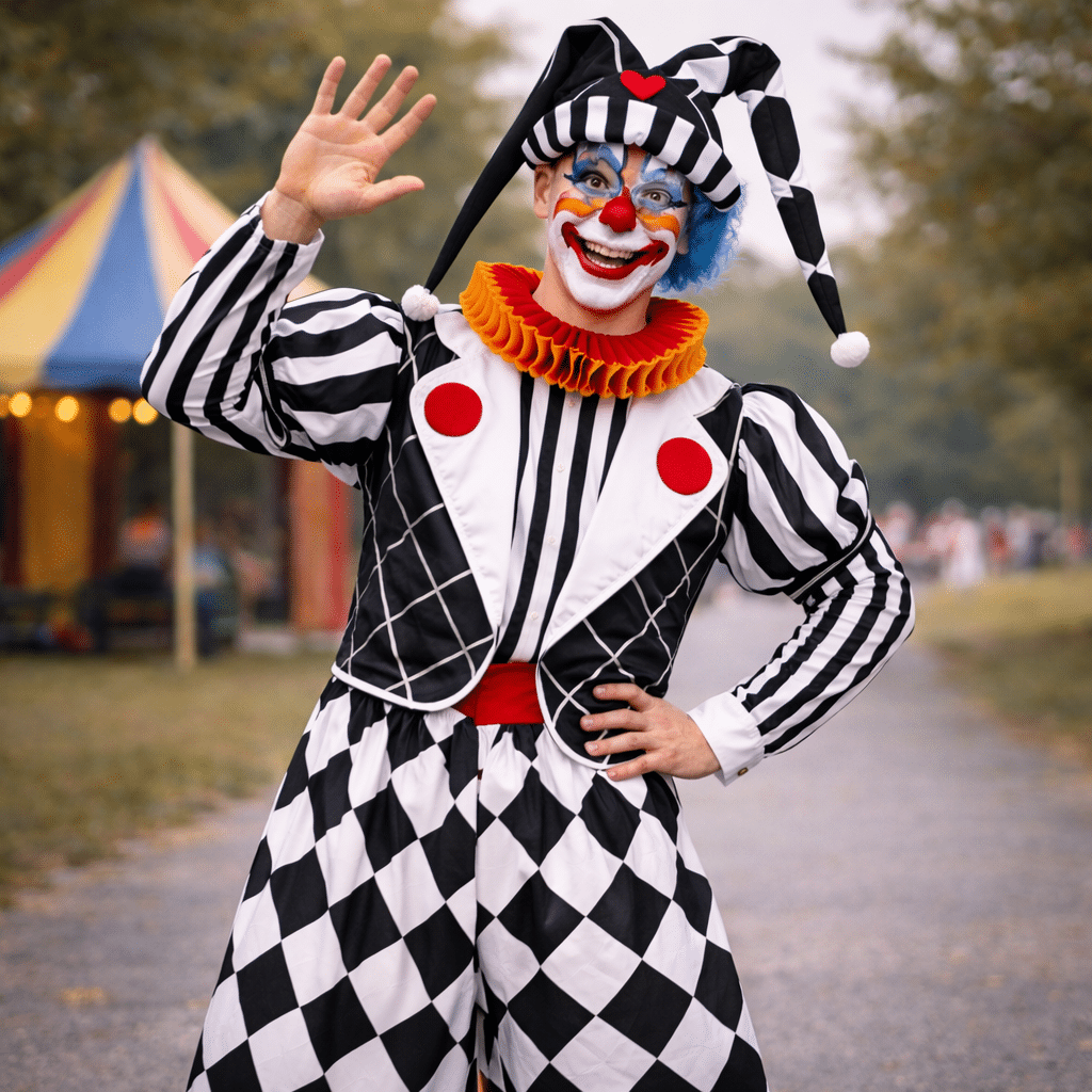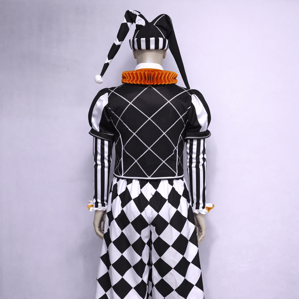 Dans les deux versions, tu as une tenue complète : pantalon large, veste et chemise avec colerette rouge. Le pantalon large donne une vraie présence, laisse bouger sans gêne, et rend les gestes plus visibles quand tu joues devant un public. La colerette apporte tout de suite le côté clown et aide à créer un look marqué, même sans maquillage compliqué.