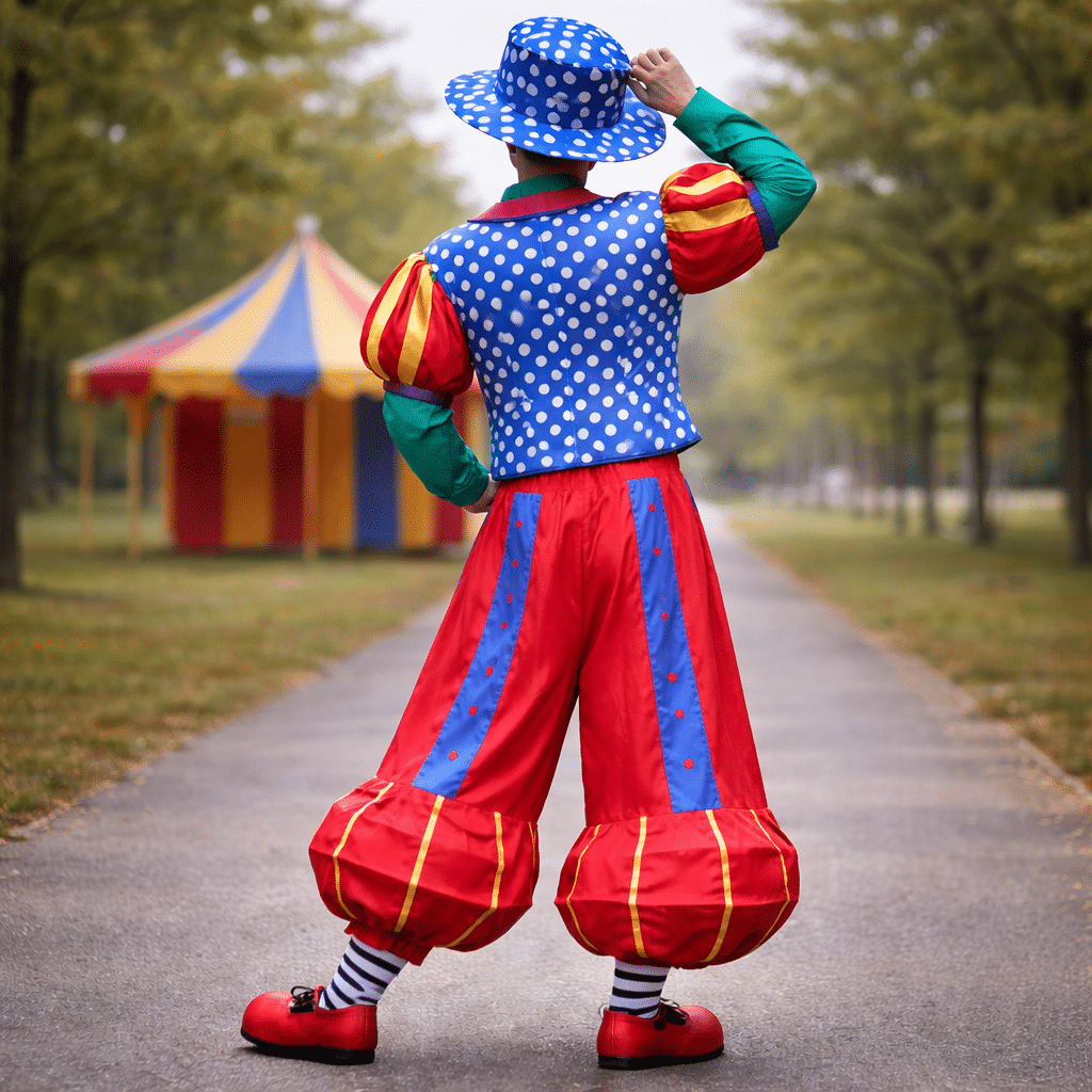 Le set est complété par le chapeau meme motif, pratique pour garder le thème du costume sans chercher d’accessoires en plus. Le costume clown spectacle se garde facilement au fil des saisons : il se nettoie à la main et il est concu pour durer, pour enchaîner les événements sans stress.
