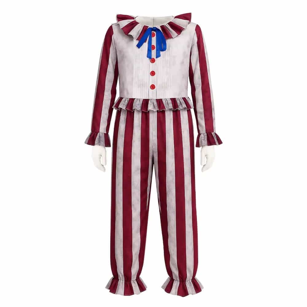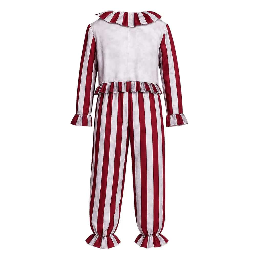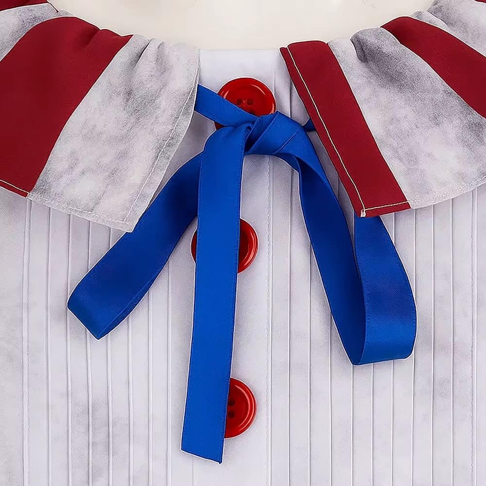 Le haut est marqué par une colerette qui donne du volume autour du cou et un vrai rendu clown. Les boutons rouges sur le haut renforcent le côté ancien et rendent le costume plus visible sur photo ou sous les lumières. Le polyester respirant et résistant supporte les mouvements, les jeux et les passages répétés, tout en restant agréable quand vous le portez longtemps.