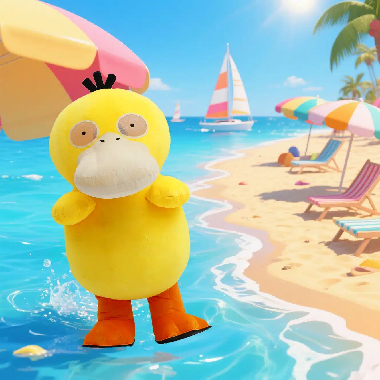 Un design coloré et amusant avec un canard jaune, un long bec et des pattes orange, pensé pour faire sourire petits et grands. Son allure décalée apporte une touche originale et marquante à toutes vos prestations.