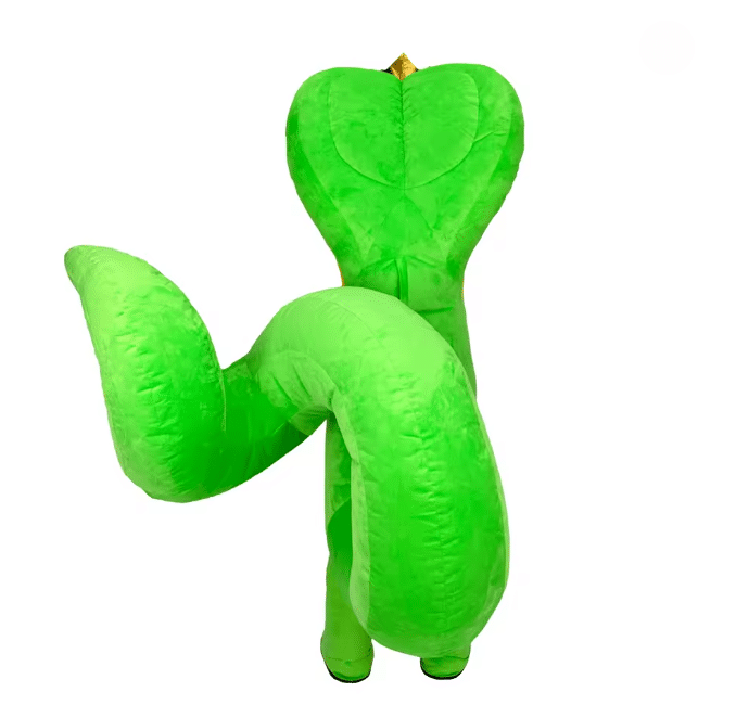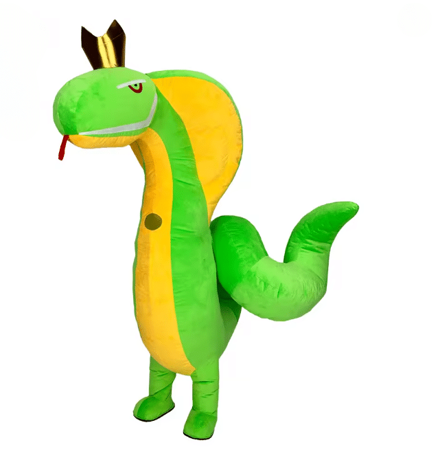 Le costume gonflable cobra vert et jaune capte immédiatement l’attention avec sa grande collerette déployée et sa couronne posée sur la tête, donnant une allure majestueuse et impressionnante. Grâce au souffleur intégré, la mascotte conserve une forme bien gonflée et stable pendant toute l’animation, ce qui assure un volume homogène et une présence forte, même lorsque vous bougez ou dansez.