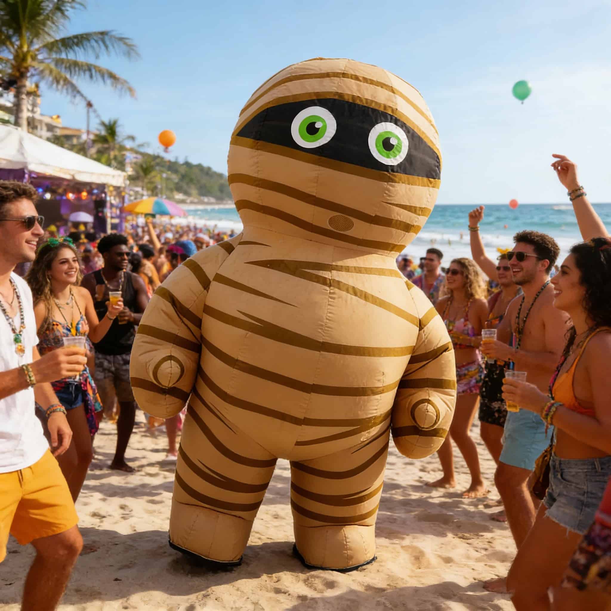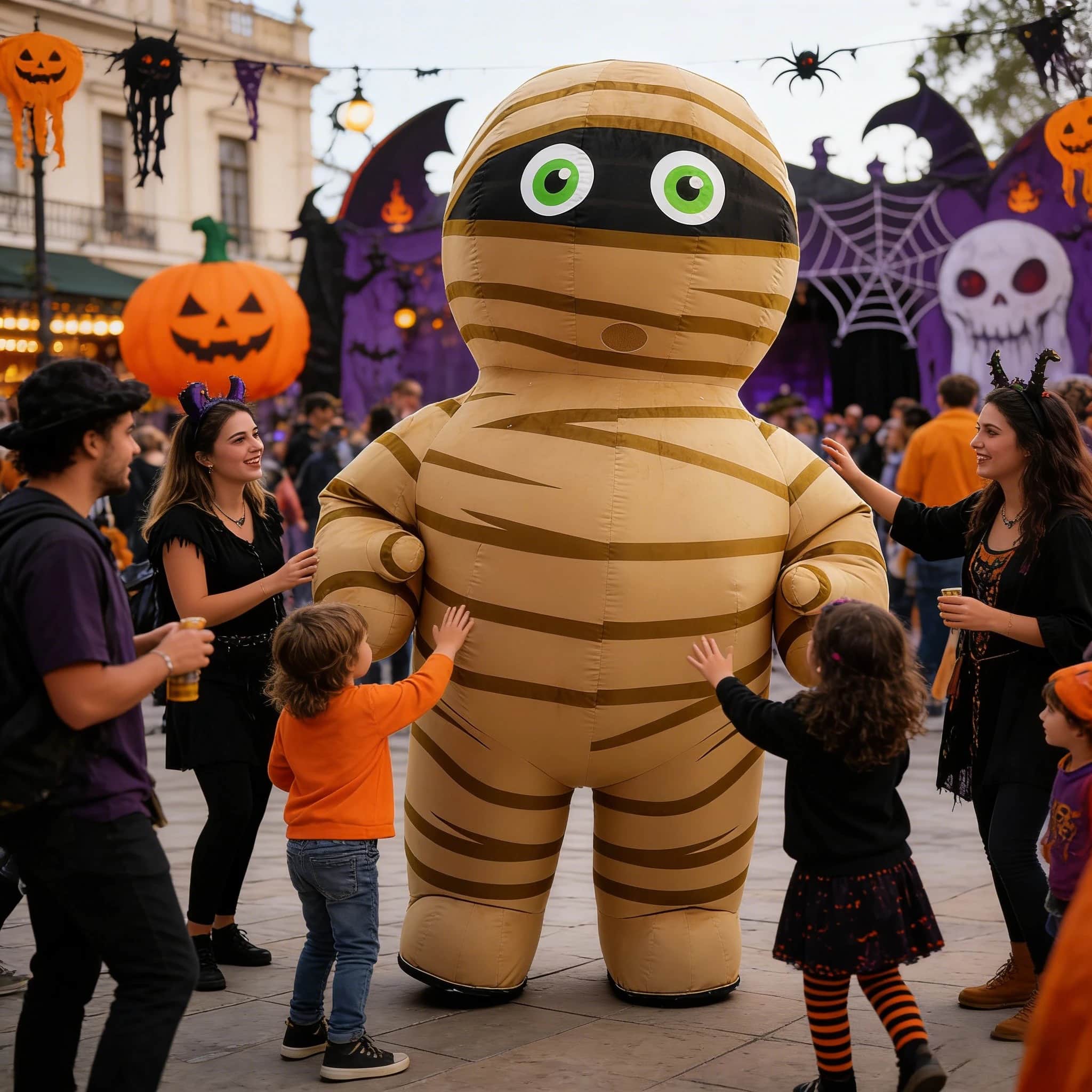 Facile à enfiler grâce à une fermeture éclair discrète à l’arrière, ce costume est rapide à mettre en place avant chaque utilisation. Disponible en hauteur 2,20 mètres, il est adapté aux personnes mesurant entre 1,50 m et 1,75 m, assurant un port équilibré et confortable. Le costume gonflable personne momifiée est une solution idéale pour créer une animation visible, originale et mémorable.