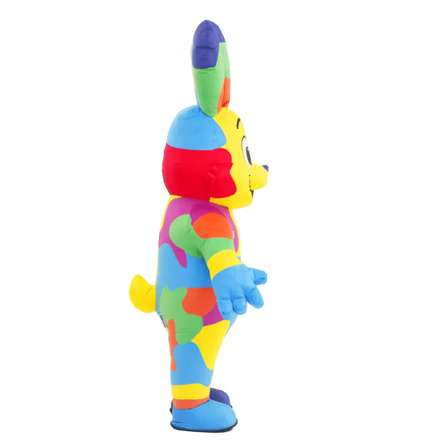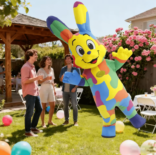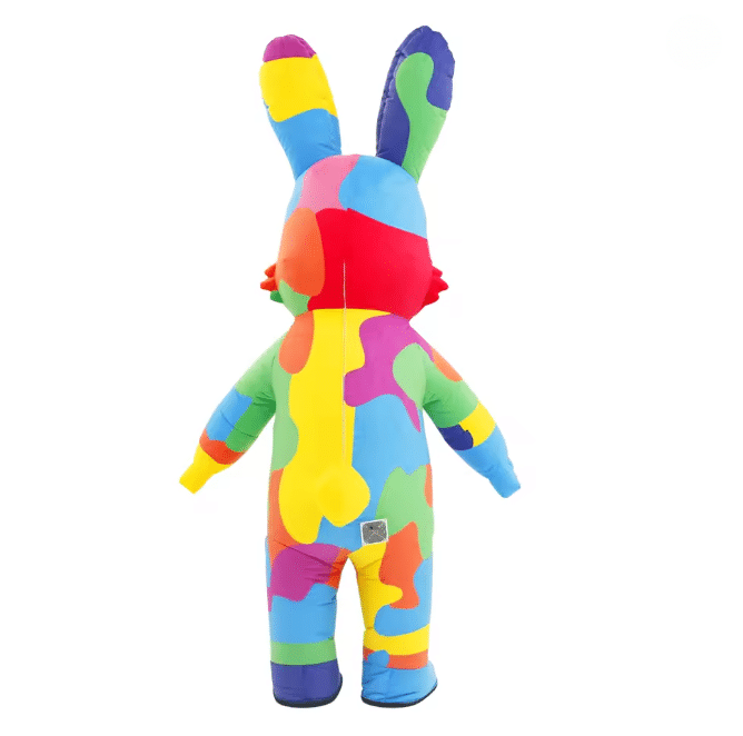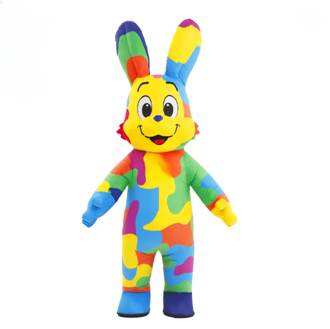Le costume gonflable mascotte lapin joyeux garantit une forme bien gonflée et stable pendant toute votre animation grâce à son souffleur intégré. Son design coloré avec des touches multicolores vives attire immédiatement l’attention, idéal pour Pâques, un anniversaire ou une fête conviviale.