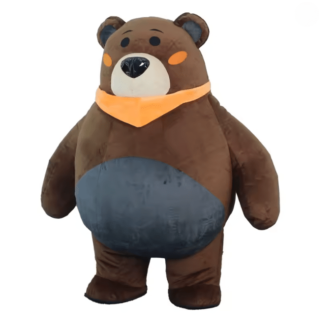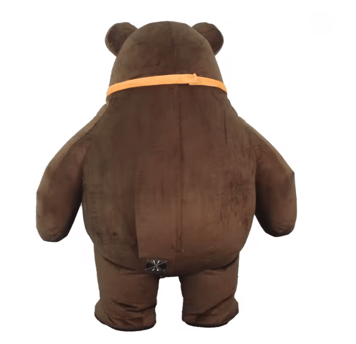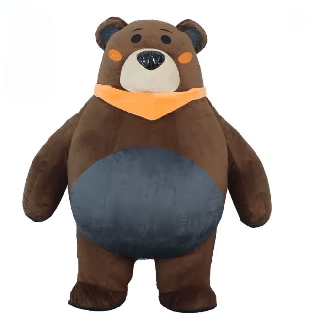 Le costume gonflable ours marron avec ventre gris attire immédiatement l’attention grâce à sa silhouette généreuse et son foulard orange qui apporte une touche vive et chaleureuse. Son souffleur intégré permet de garder une forme bien gonflée et stable pendant toute la durée de l’animation, même lorsque vous marchez ou dansez, pour un effet visuel constant et percutant.