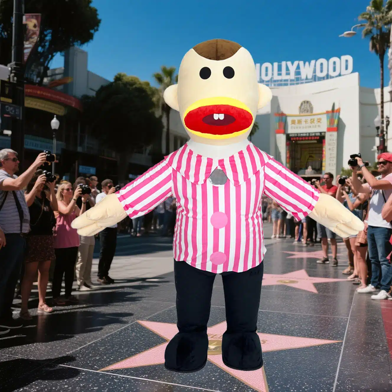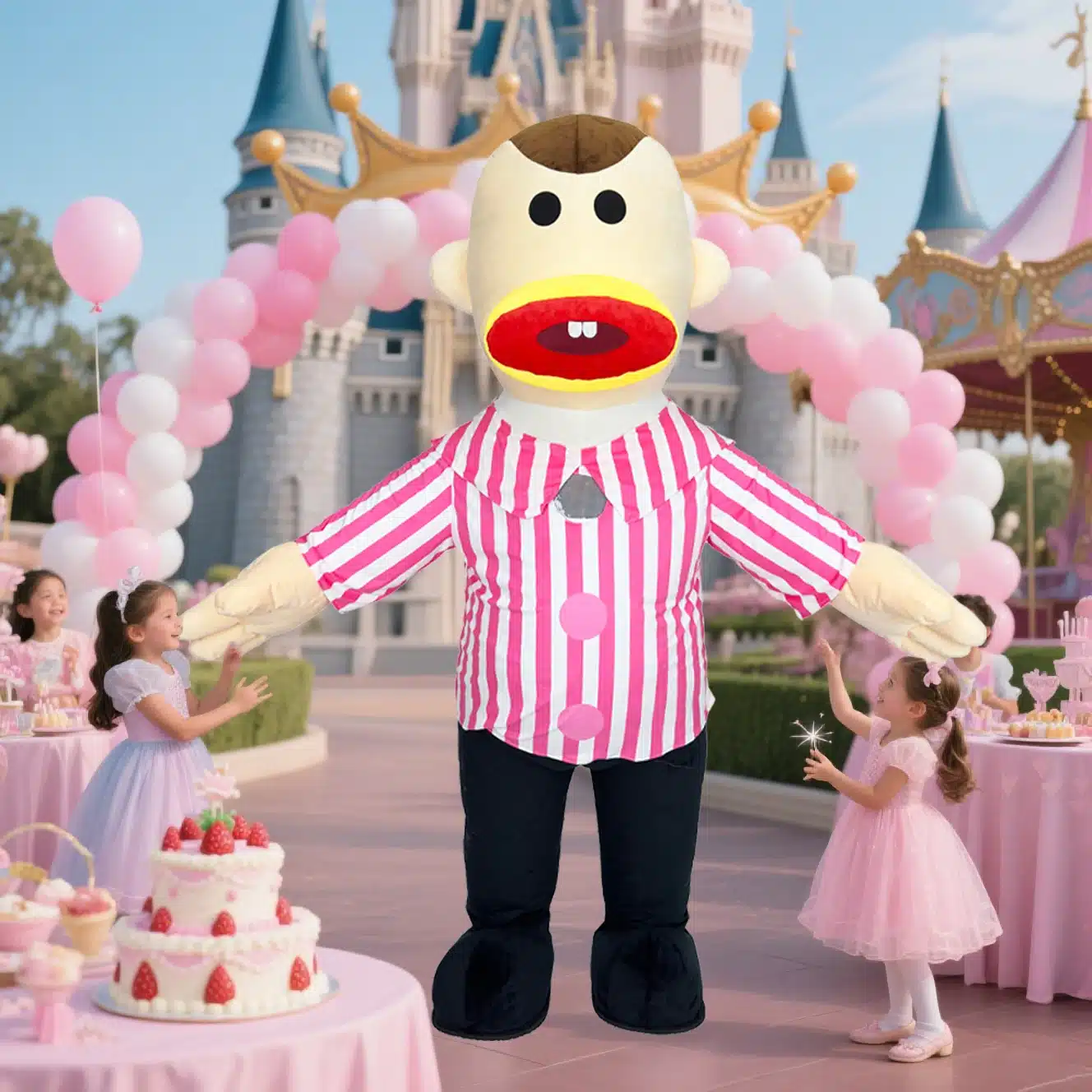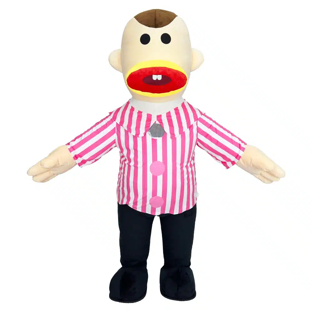Le design humoristique du costume gonflable personnage à grande bouche ne passe pas inaperçu. Il représente un homme avec une énorme bouche et deux dents qui dépassent, habillé d’une chemise rayée rose et blanche et d’un pantalon noir. La tenue est visible de loin et garantit de faire rire et surprendre le public.