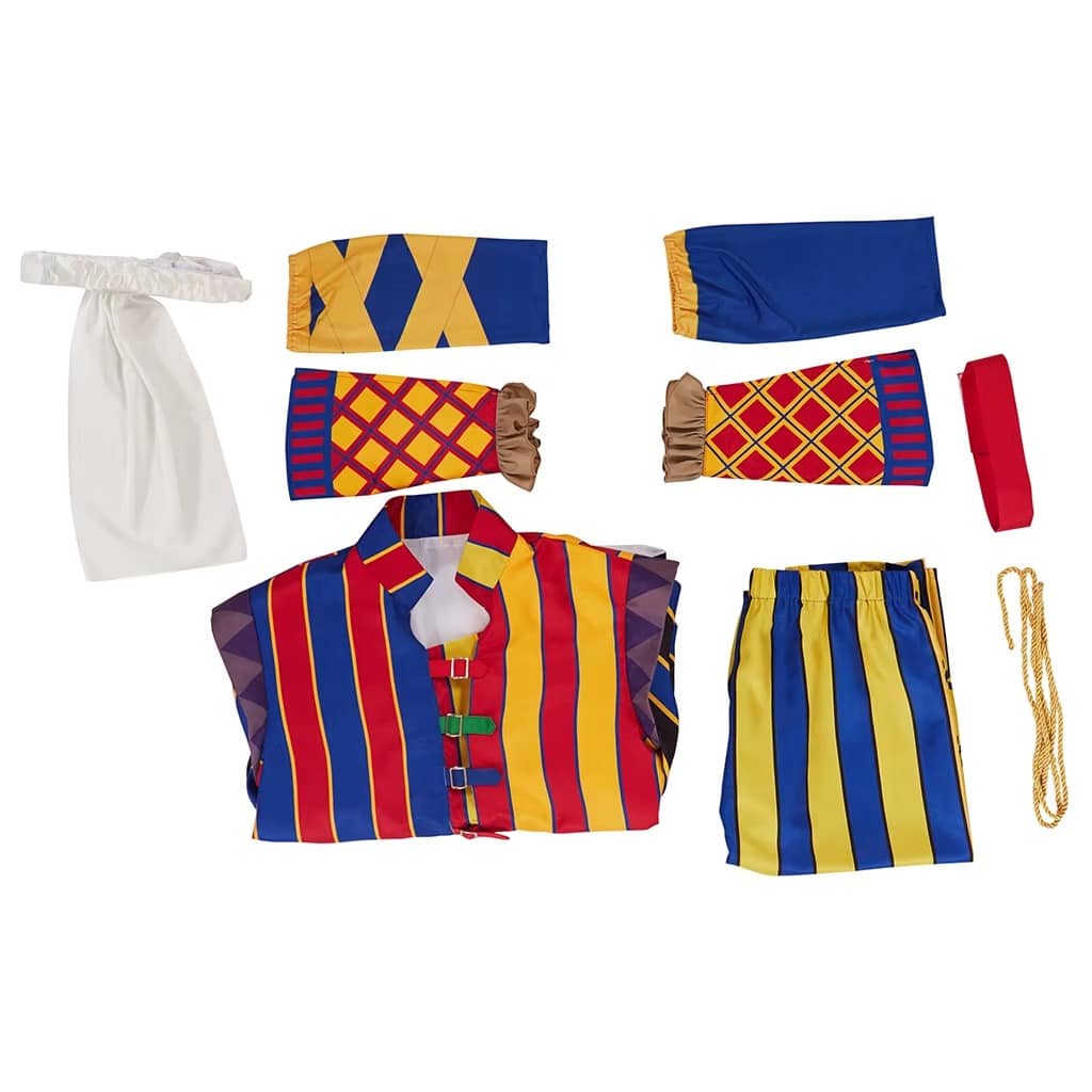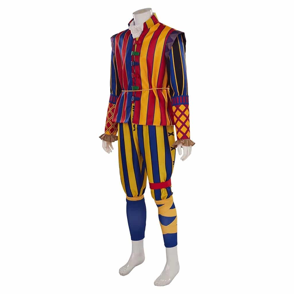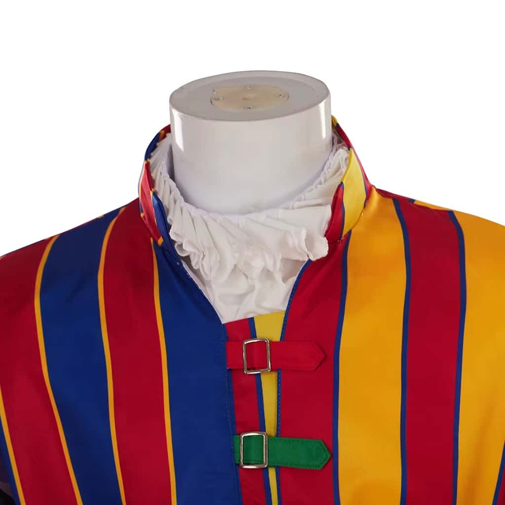 Le costume de ménestrel pour homme offre une tenue complète prête à porter, avec un haut et un pantalon assortis pour composer rapidement un personnage médiéval crédible. Les rayures colorées bleu, jaune, rouge et bleu créent un rendu visuel fort qui capte l’attention sur scène ou en animation. Ce style expressif fonctionne aussi bien pour le cirque, le jonglage que pour des événements à thème médiéval ou festif.
