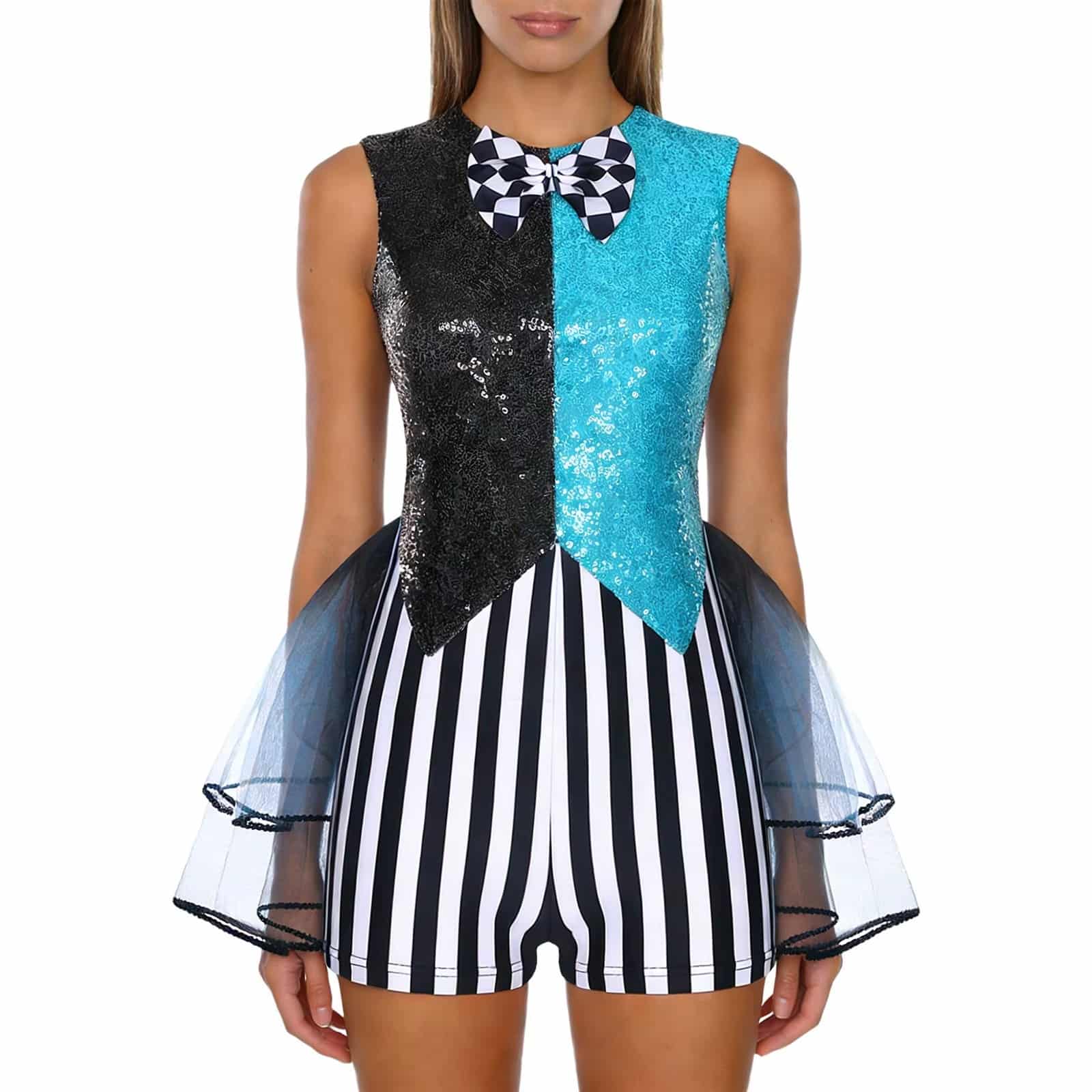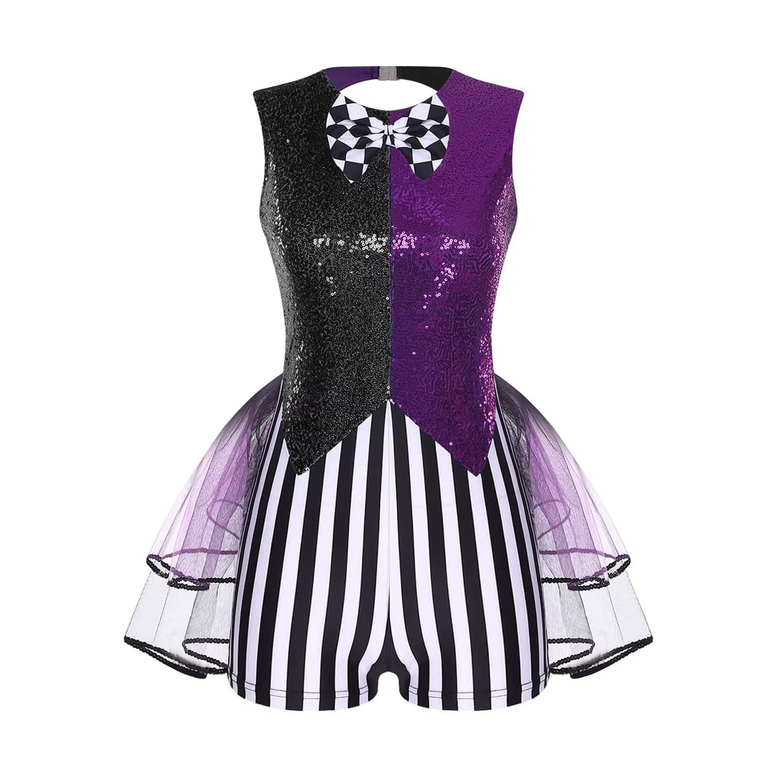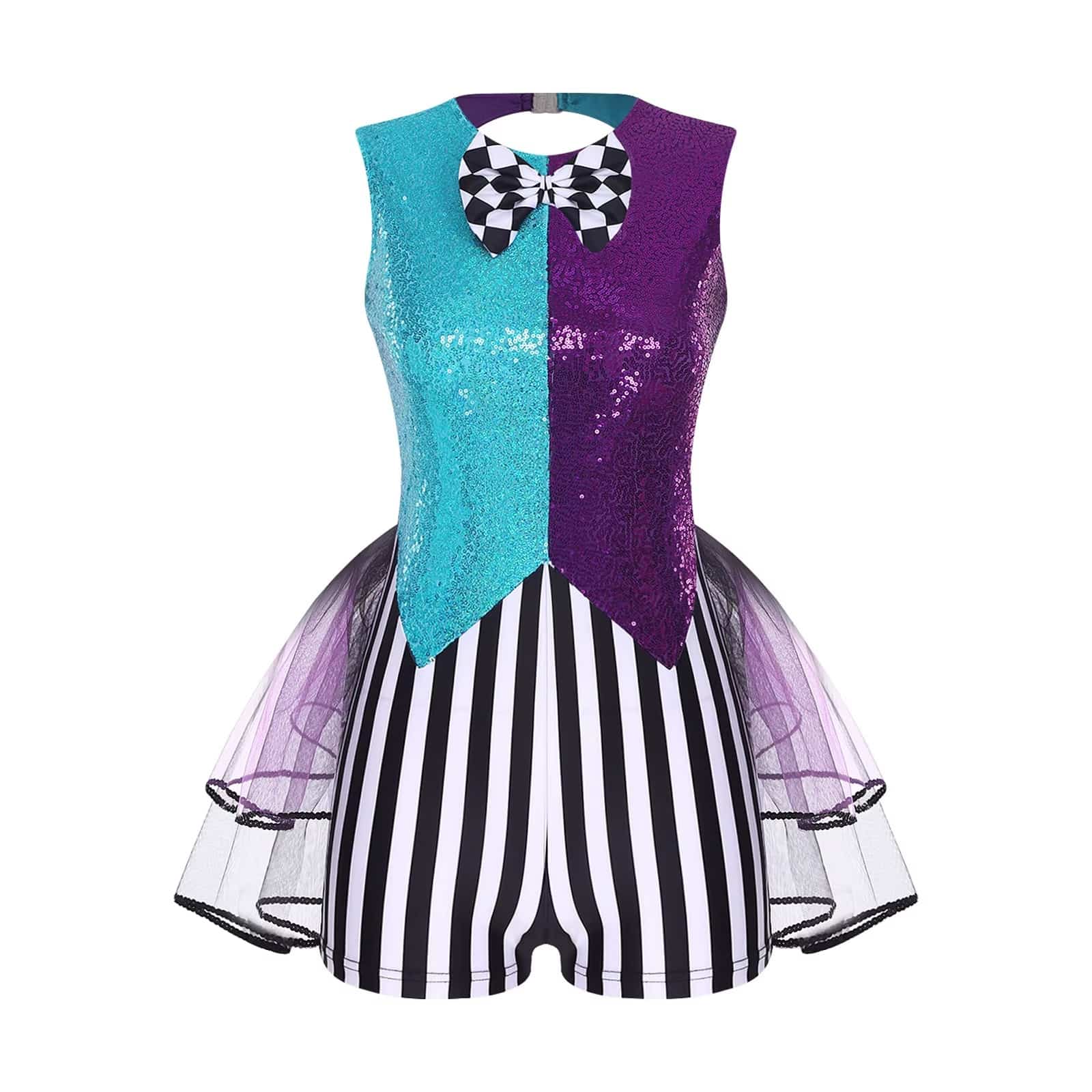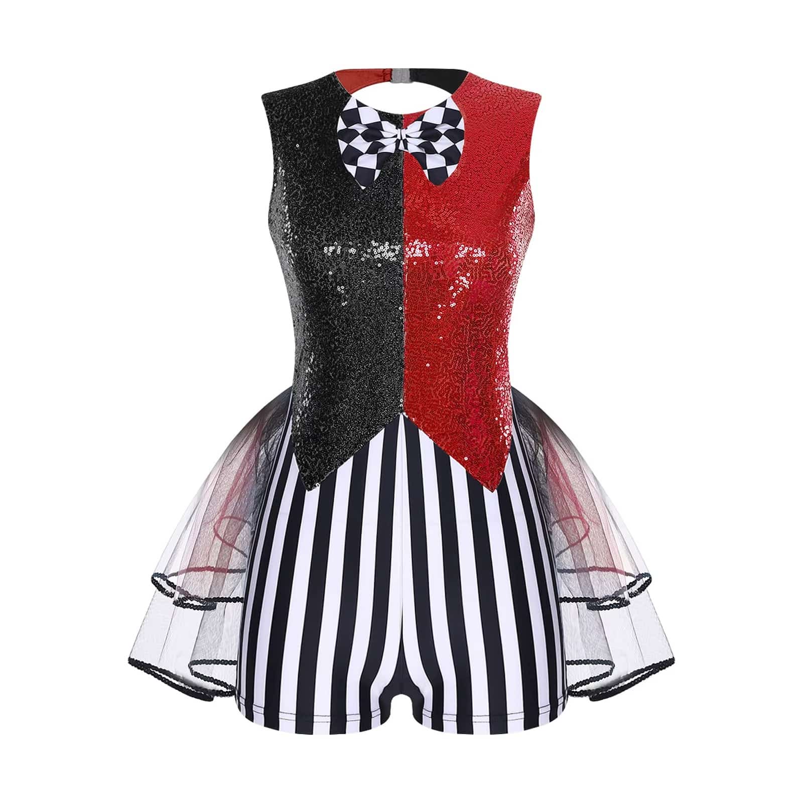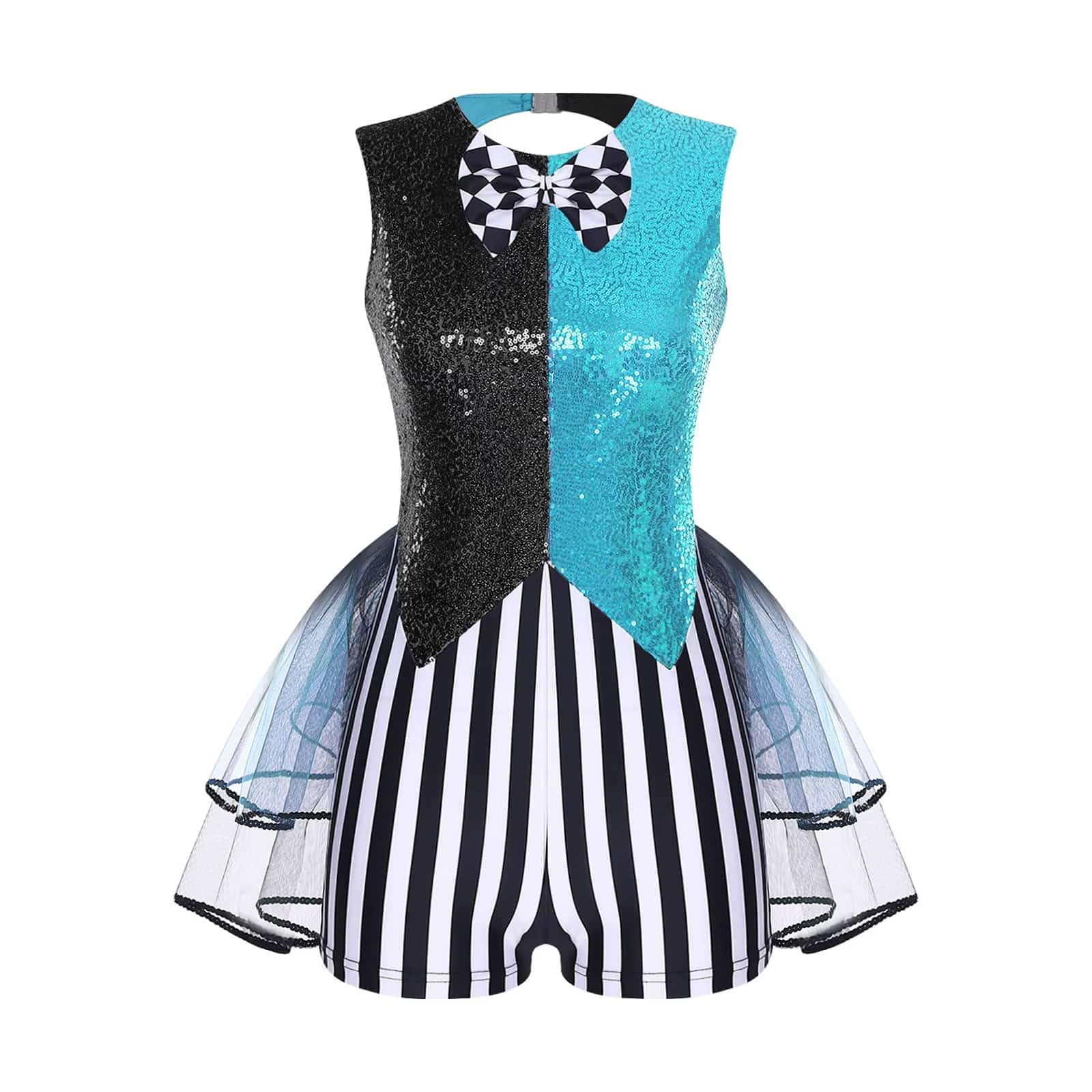 Le design color-block, associé aux paillettes et au patchwork rayé, donne un style moderne et audacieux. Le nœud papillon à carreaux ajoute une note ludique, tandis que l’ourlet en tulle à plusieurs niveaux apporte du volume et du mouvement à chaque pas. Les découpes tendance renforcent le côté original et apportent une touche contemporaine à la tenue.