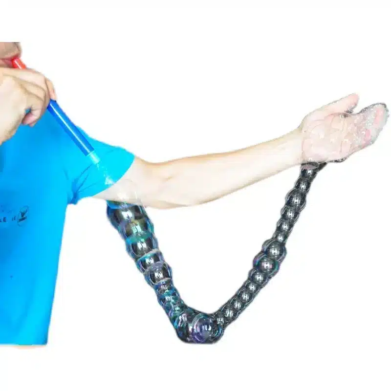 La suite se joue avec une coordination simple à comprendre : souffler tout en “tirant” pour donner du mouvement et créer l’effet de performance. Le tube souffleur à bulles permet de travailler des enchaînements en gardant la main libre pour guider la forme, ce qui rend la pratique plus fluide. Le point clé reste le contrôle : maîtriser la vitesse du souffle change tout sur la taille, la tenue et la régularité des bulles. Après plusieurs répétitions, vous sentez quand ralentir, quand relâcher, et quand tirer plus loin pour garder un résultat propre.
